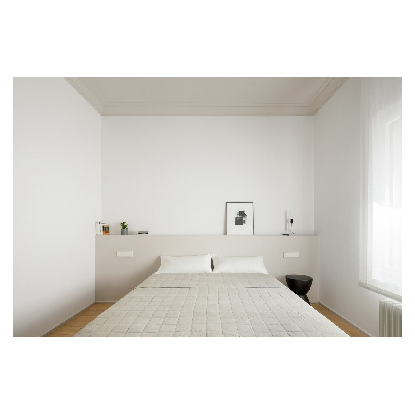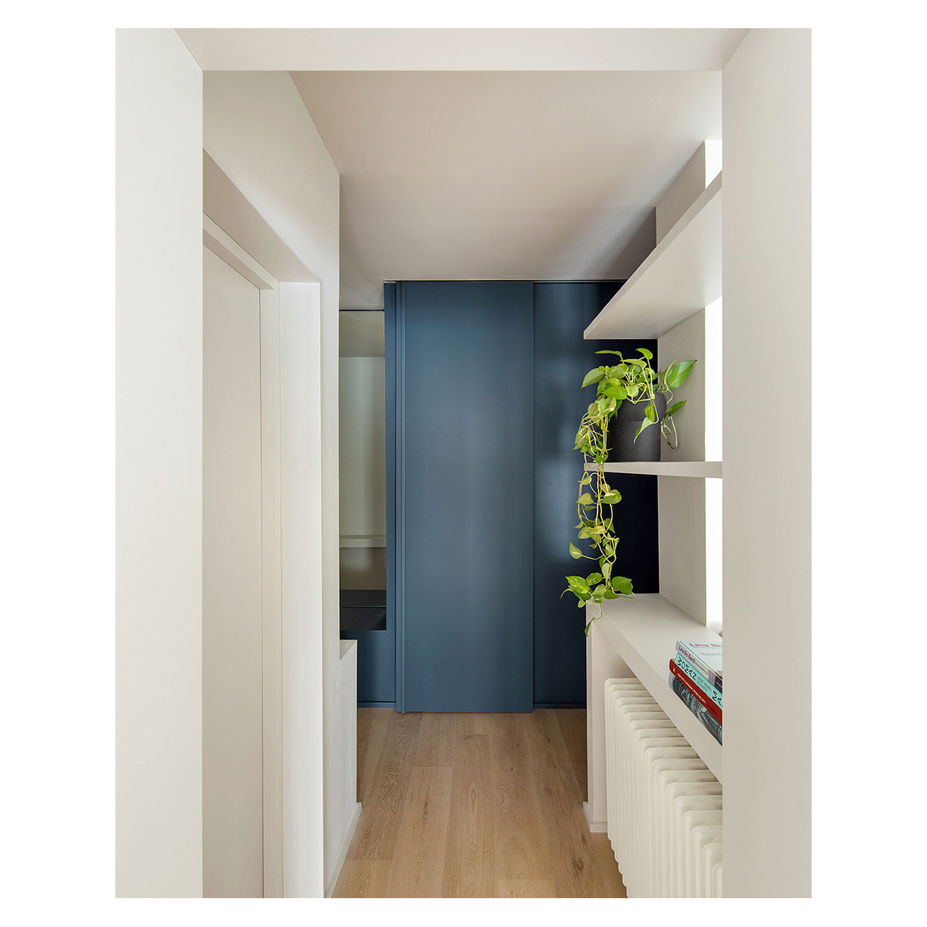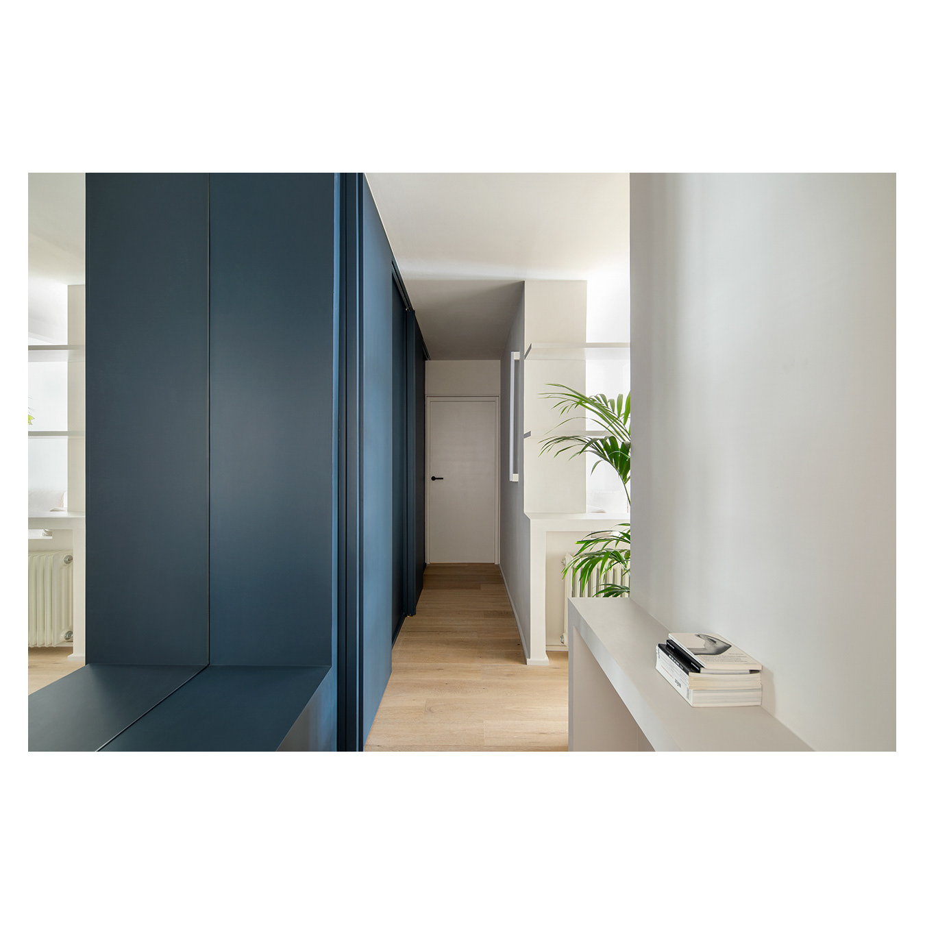 This 112 m² apartment in Sant Gervasi was completely reconfigured to create a master suite, two bedrooms, and a spacious open-plan living area with kitchen, dining, and lounge. A striking indigo-blue service core houses storage and utilities, while the palette of blue, white, and stone beige is warmed by natural oak flooring and custom details, giving the home a modern and serene character.
