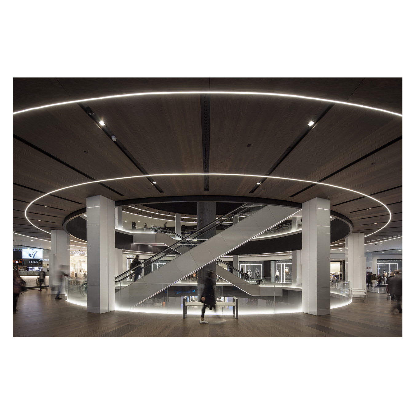 Lighting is orchestrated around the skylight, accentuating the linearity of the corridors. It defines the main pathways while introducing a playful, sculptural quality that interacts with the skylight, allowing natural light to permeate the space during the day.