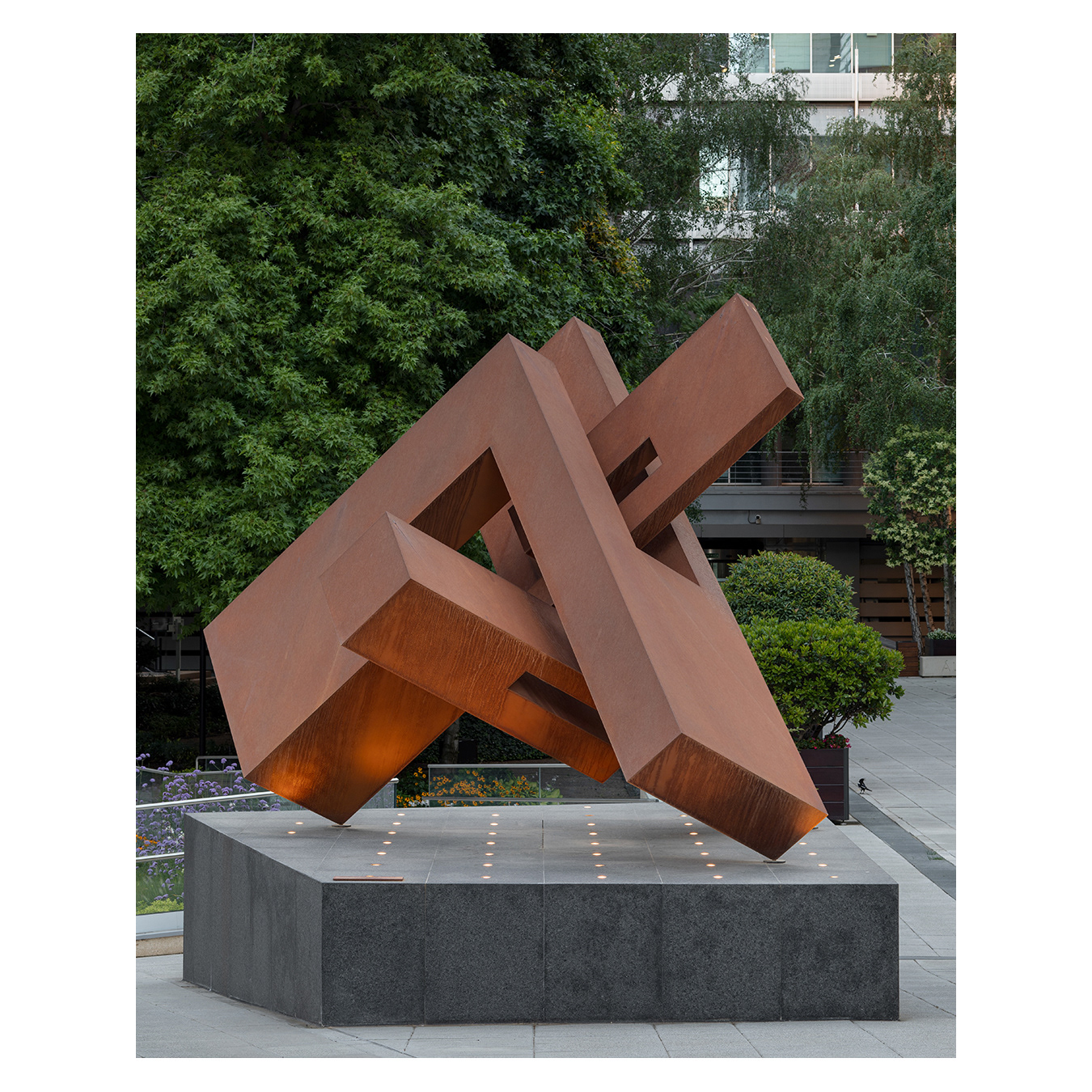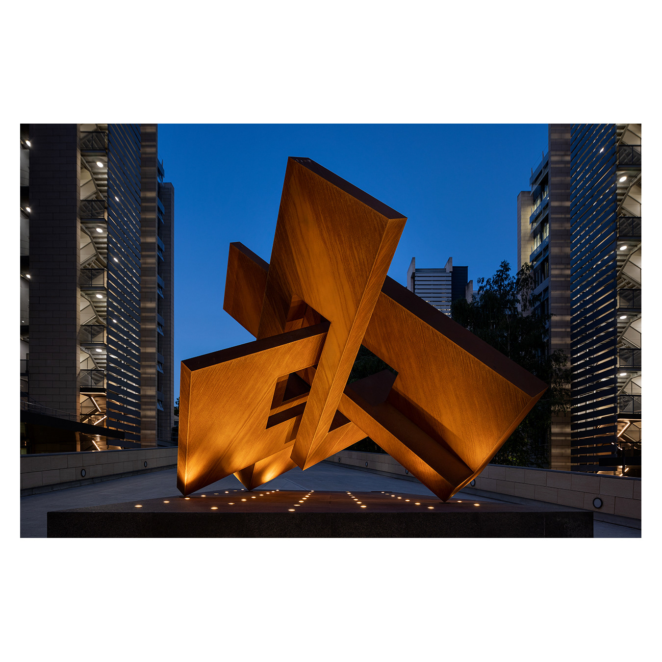Photographed to emphasize its monumental presence within the office park, the series highlights the dialogue between the sculpture, its surroundings, and the experience of the passerby.