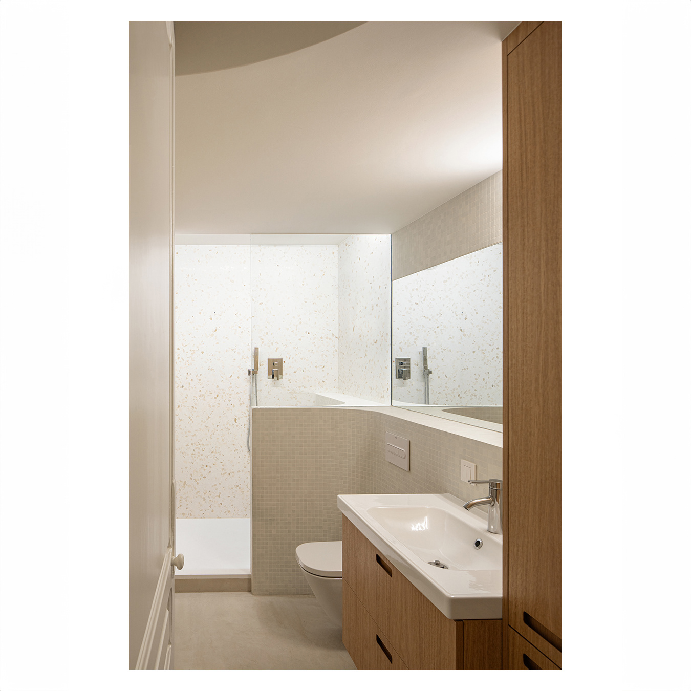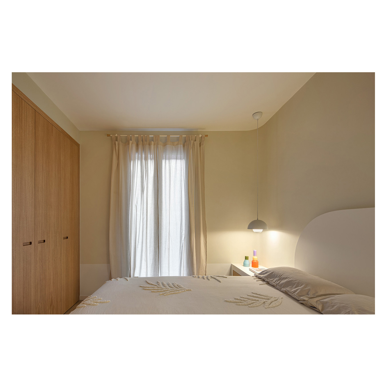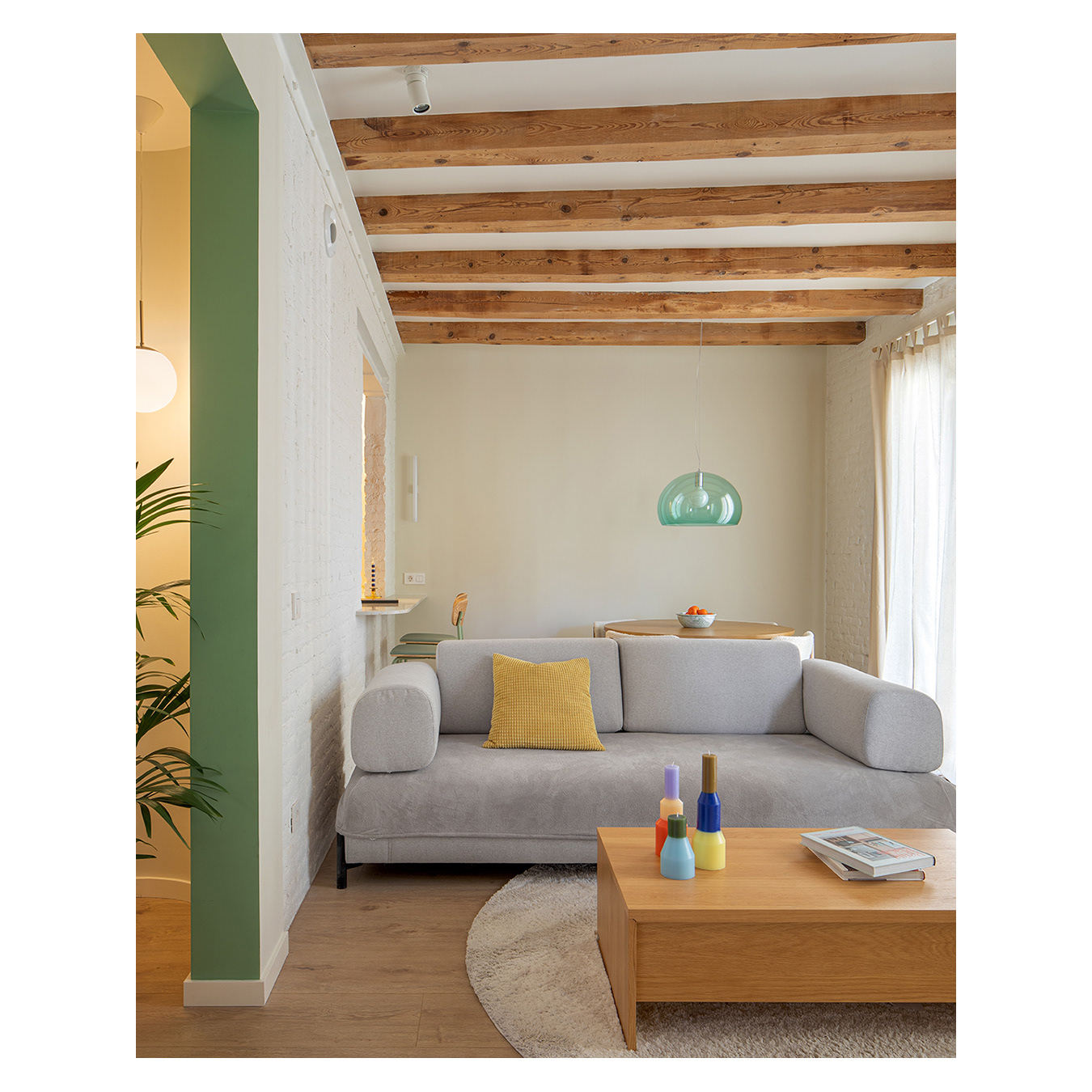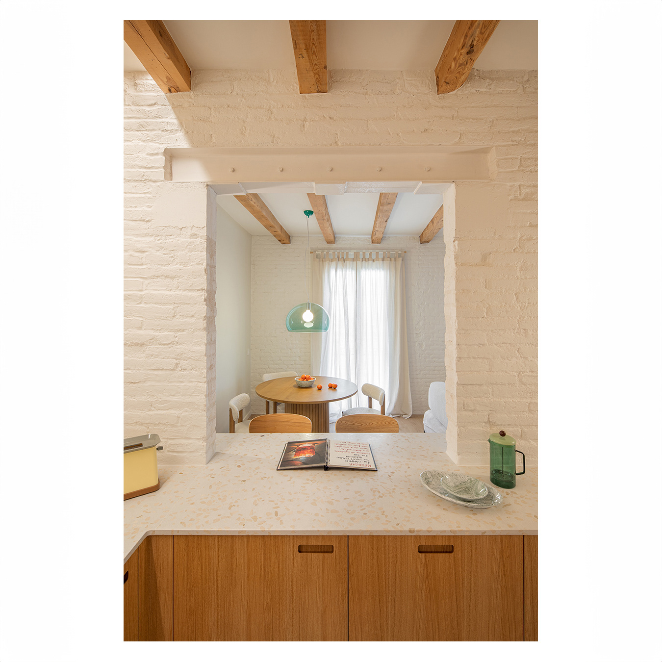 This integral renovation transformed a classic Eixample apartment into a functional and welcoming home for a mother and her young son. The kitchen was relocated to a brighter area and connected to the living-dining room with a family breakfast bar. A new partition organizes the living area, creating both a spacious lounge and a home office. The redesign separates day and night zones, adds ample storage, and balances openness with warmth—tailored for long-term family living.