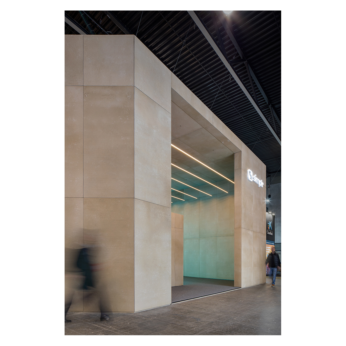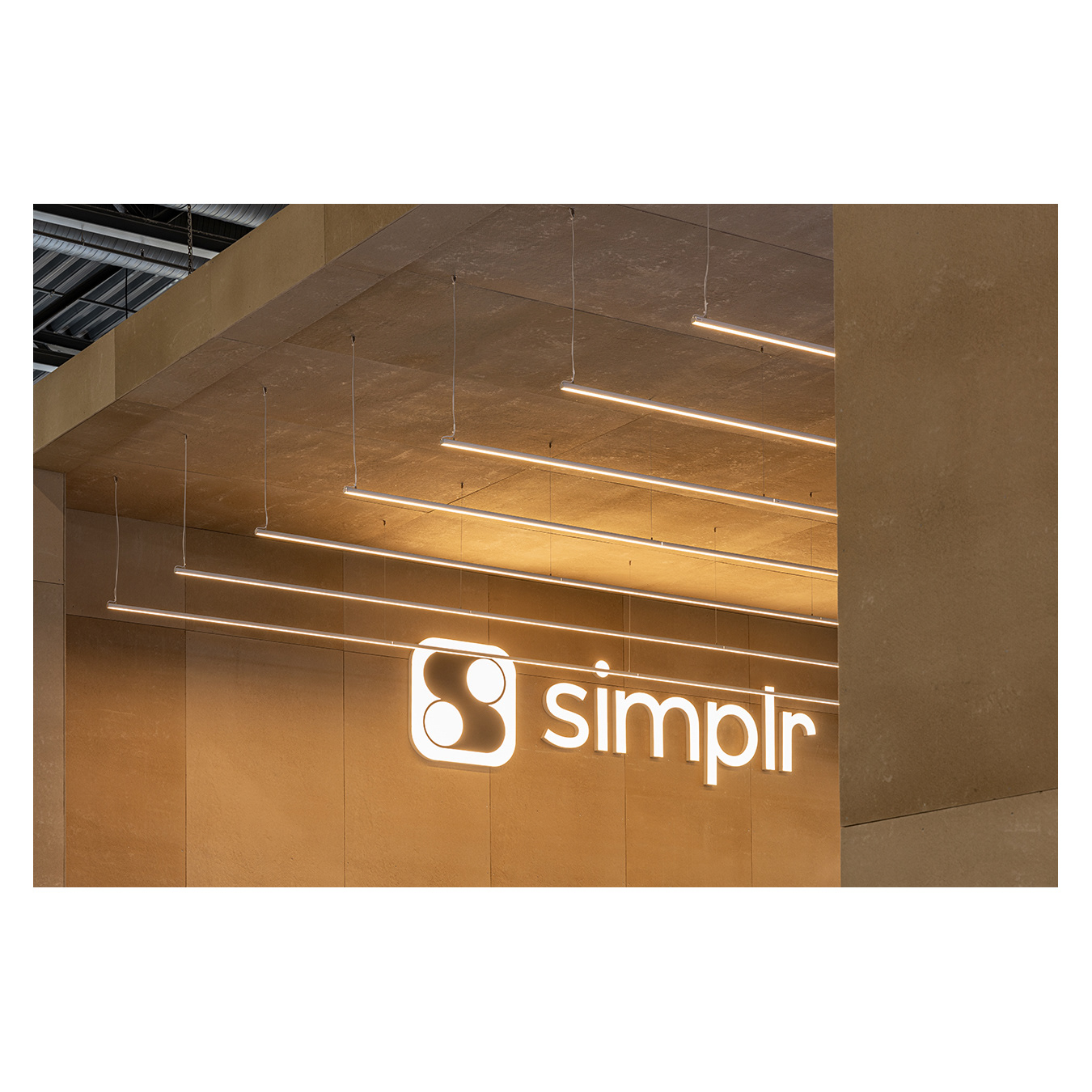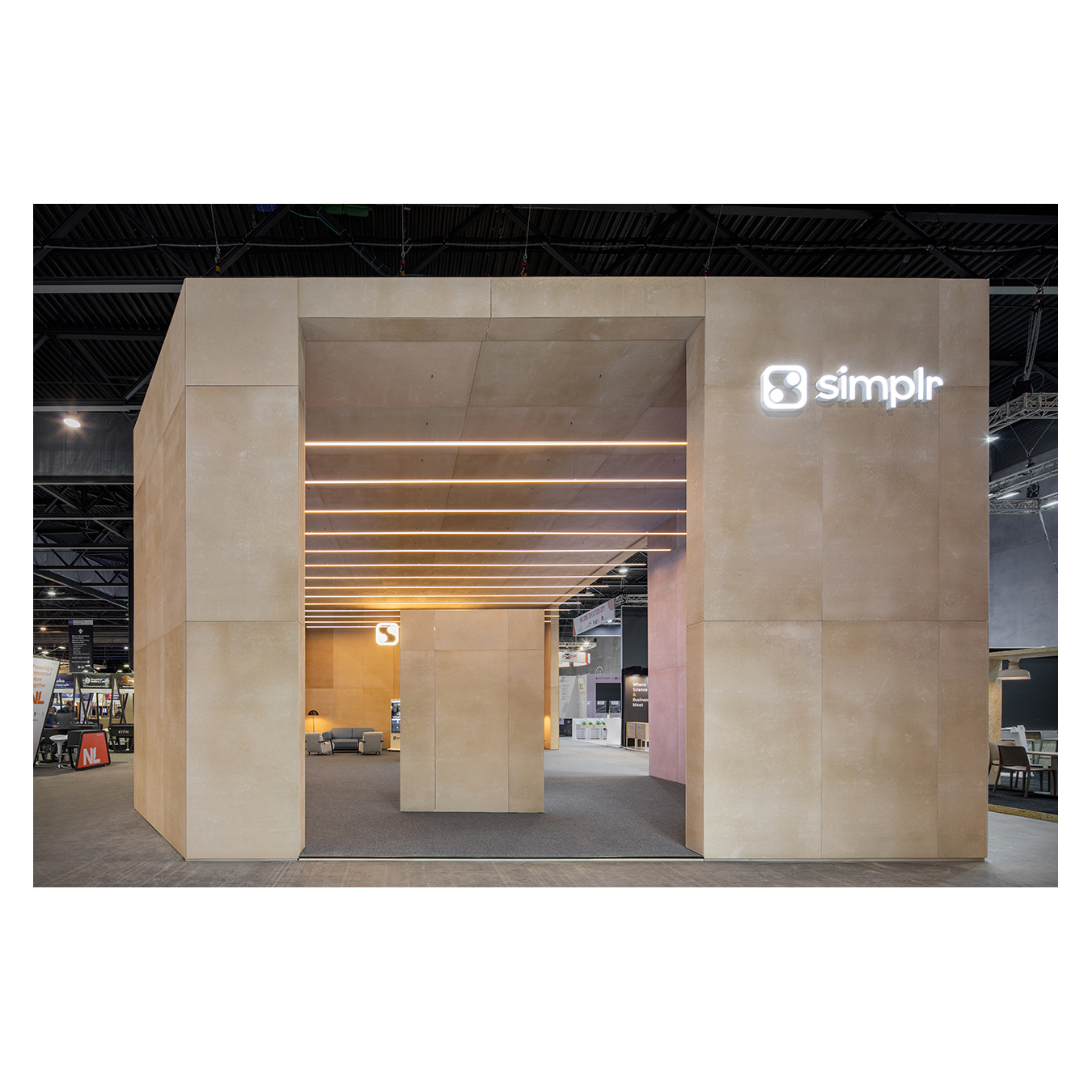 Minimal yet impactful, its raw materials, warm lighting, and dual video walls created a welcoming presence that reflected Simplr’s brand while showcasing how temporary architecture can deliver true positive impact.