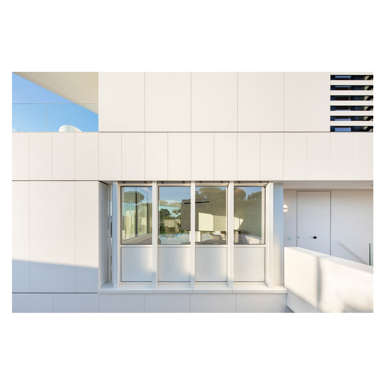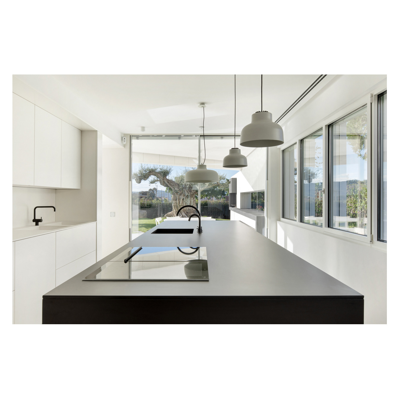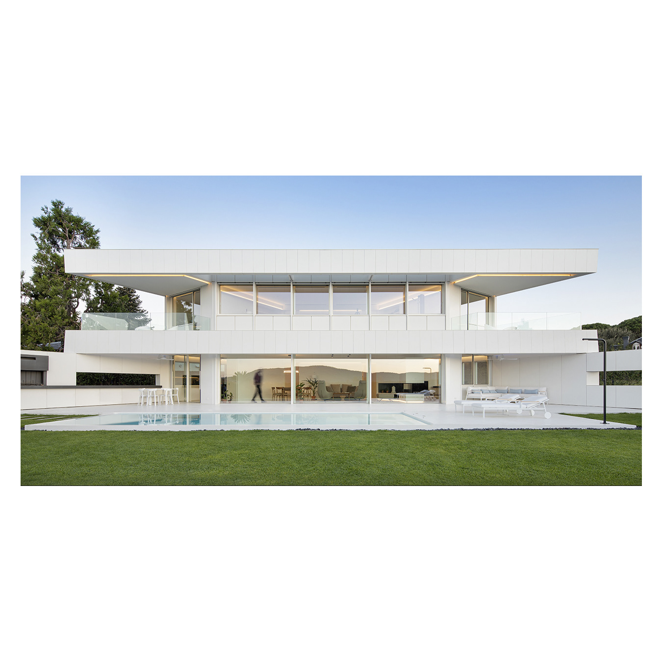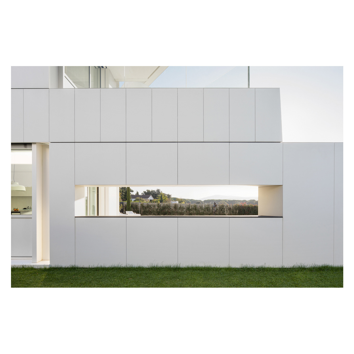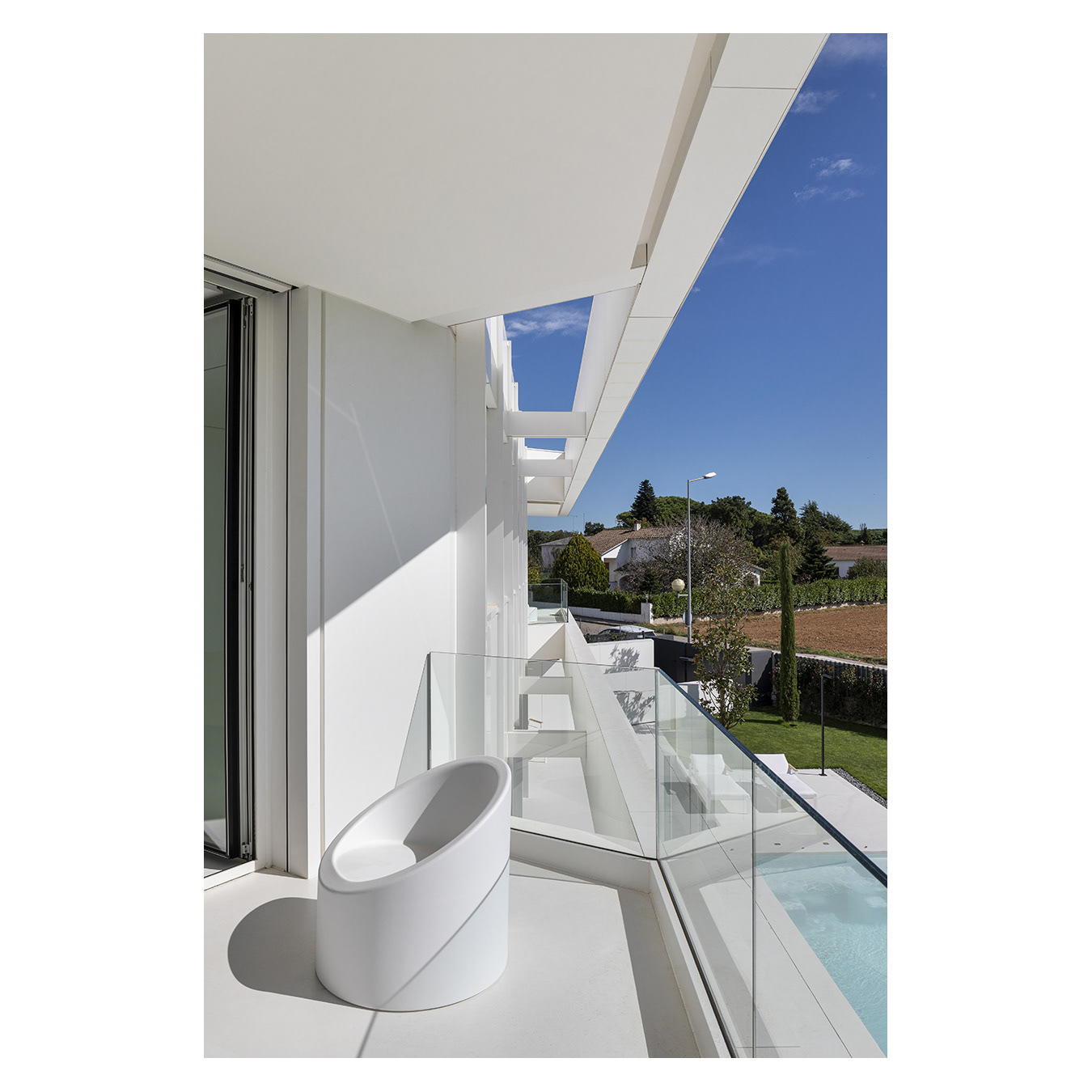 The ground floor accommodates all main functions, while the first floor offers bedrooms with terrace access and multipurpose rooms. Photographed to highlight geometry, material continuity, and the strong connection between house and garden.