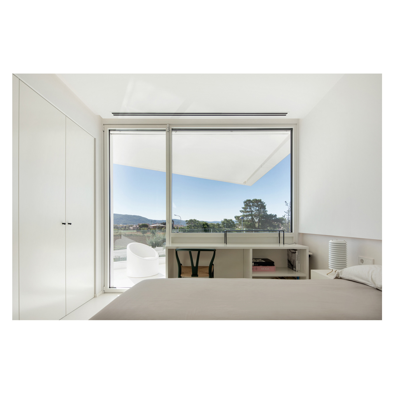 Set within a garden plot, this triangular residence opens its southeast-facing façade to the landscape. Terraces at the corners, a large ground-floor porch, and a central double-height space resolve the singular geometry, bringing light and clarity to the interior.