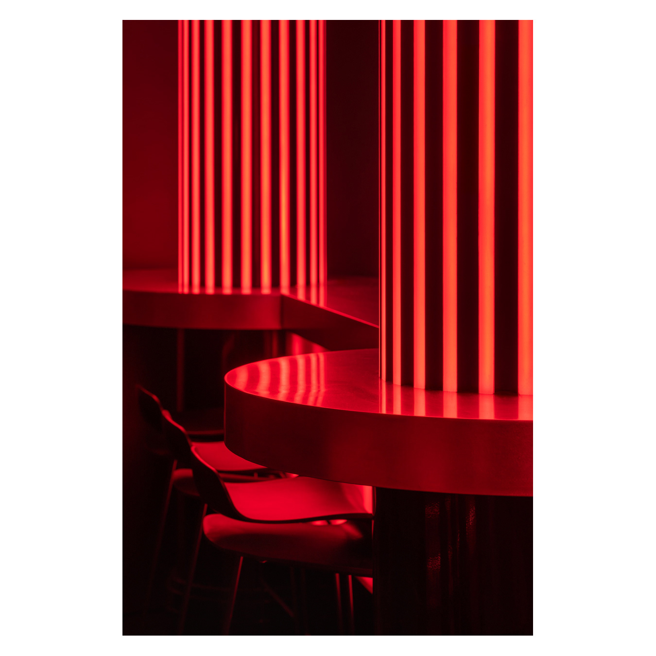 Inside [UNVRS], the world’s largest nightclub, VICIO Burger Club by External Reference blends gastronomy with clubbing culture across 250 m² and two levels. A double-height main floor, mezzanine seating, and custom-designed furniture create a vibrant setting, while polished concrete, stainless steel, neon lighting, and VICIO’s black-and-red palette reinforce its bold, provocative identity.