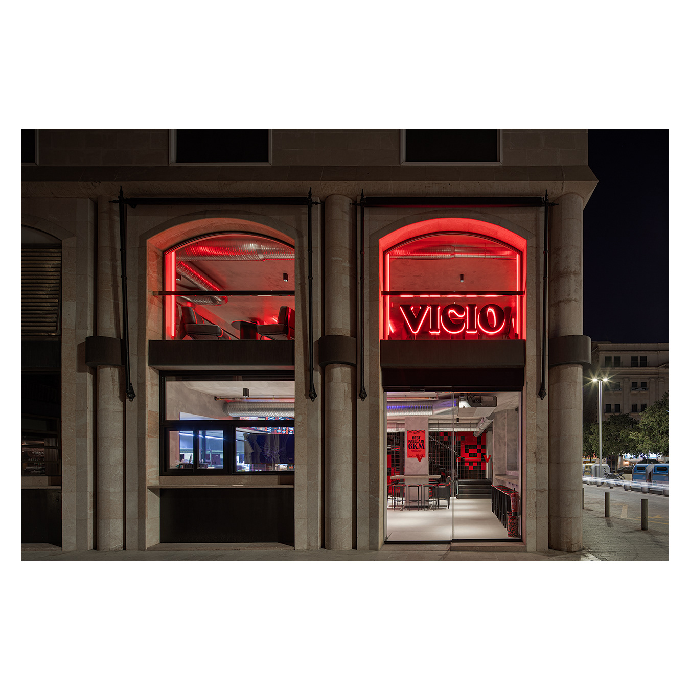 The new Vicio restaurant in Palma de Mallorca unfolds across three levels, each with a distinct atmosphere. The ground floor highlights the open kitchen, while the first floor hosts the dining area centered around the brand’s iconic communal table. In the basement, mirrors and lighting create an immersive restroom experience that captures Vicio’s playful spirit.