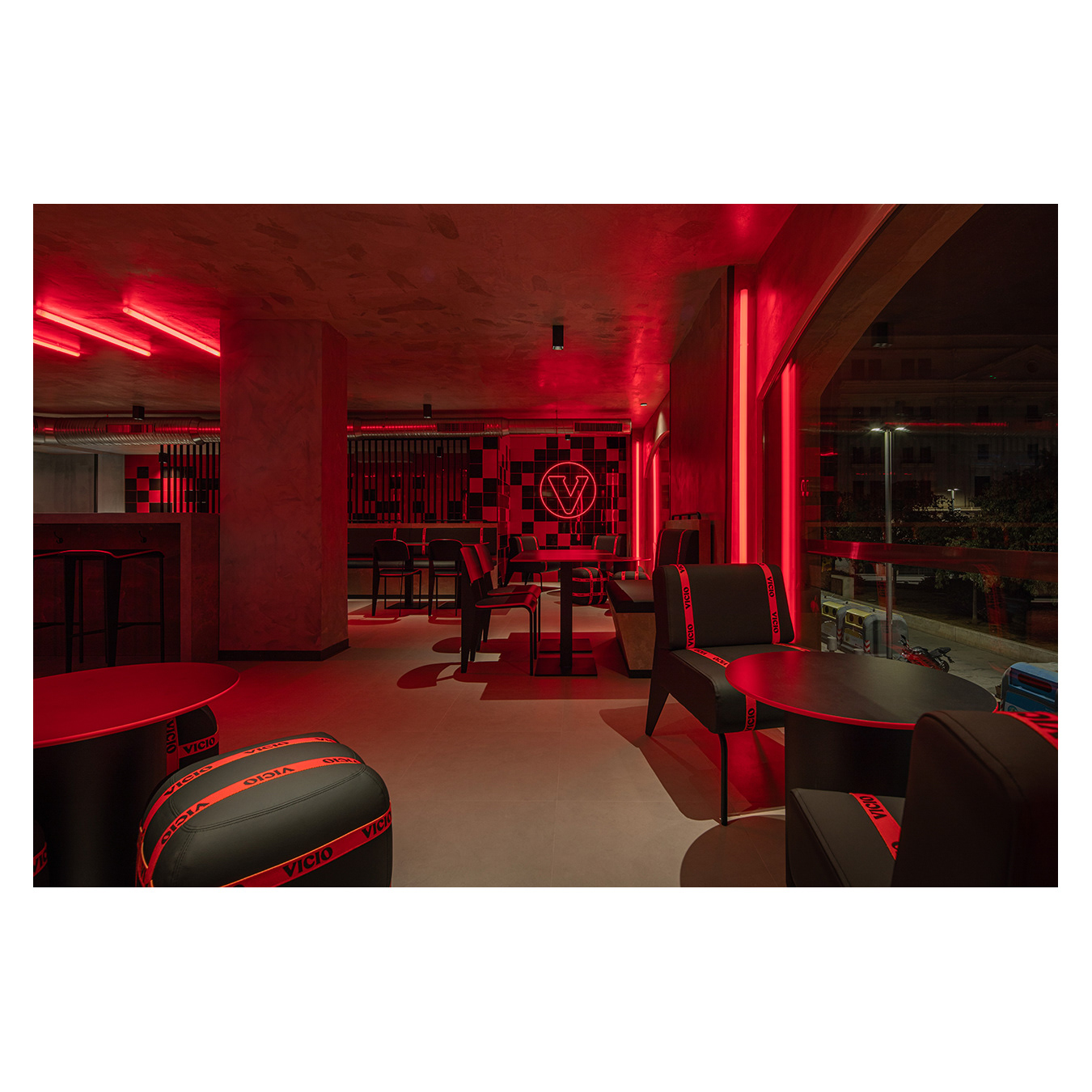 Red neon accents, black-and-red tiling, and microcement unify the design, giving the space an industrial yet vibrant character true to the brand’s identity.